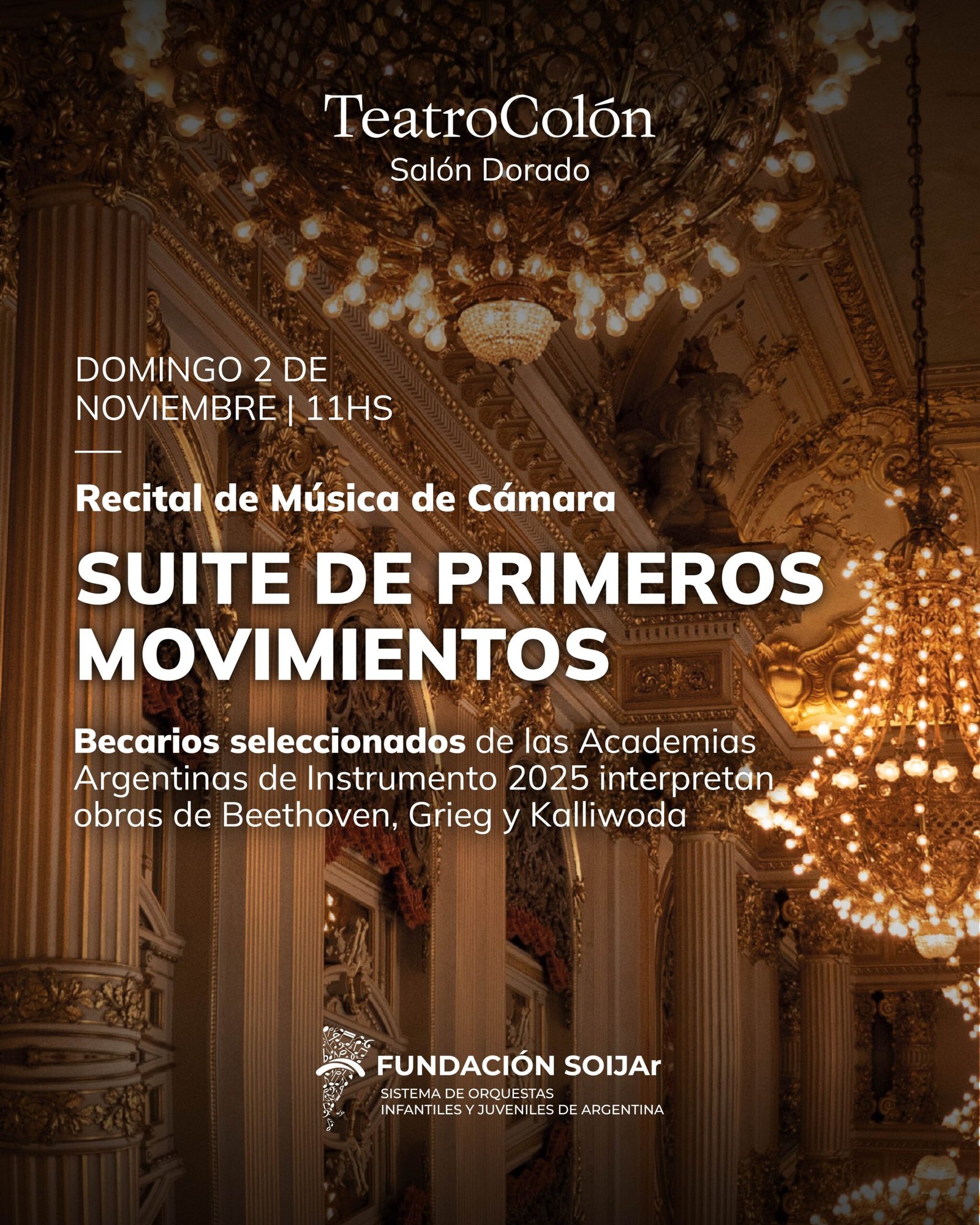 La Fundación SOIJAr anuncia la presentación del Recital de Música de Cámara de las Academias Argentinas de Instrumento, que se realizará en el Salón Dorado del Teatro Colón, el domingo 2 de noviembre a las 11:00 horas.