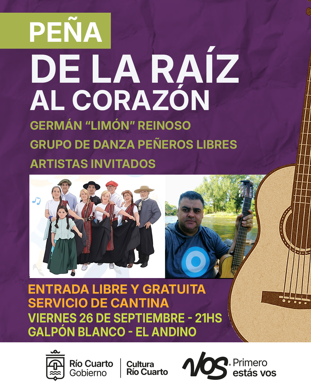 En una nueva edición de la peña folklórica local se presentan Germán «Limón» Reinoso, Grupo de Danza Peñeros Libres y artistas invitados. Servicio de cantina.