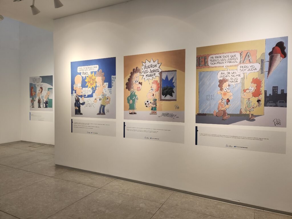 La muestra incluye 23 ilustraciones elaboradas por el reconocido humorista gráfico Adrián Franco, conocido como “Pati”. A través de sus viñetas, Pati utiliza el humor como una herramienta para abordar temas difíciles, como los estereotipos antijudíos y sus consecuencias.