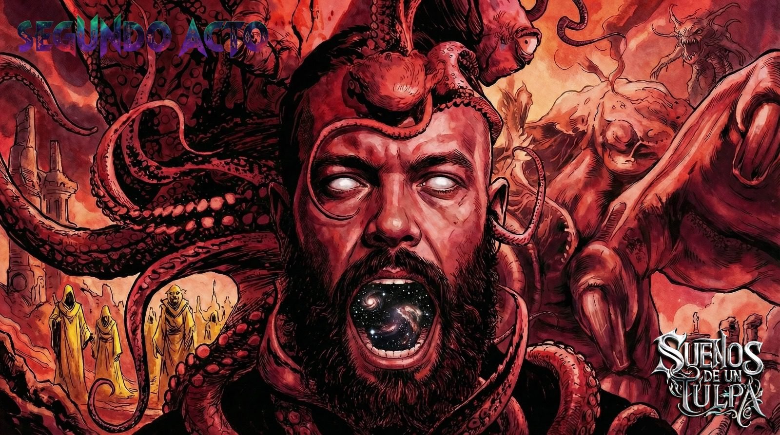 ‘Segundo acto’ es lo nuevo de Sueños de un Tulpa. Es la materialización sonora de la maldición descrita en El Rey de Amarillo de Robert W. Chambers. En esta obra ficticia, el Primer Acto es una trampa de aparente normalidad, una introducción inofensiva que baja las guardias del lector. El Segundo Acto revela verdades universales tan terribles que la mente humana colapsa al leerlas. En la canción, la voz es de un invocador iluso que demanda saber la verdad, creyéndose digno de portar la ‘omnisciencia cósmica’ del Rey de Amarillo.